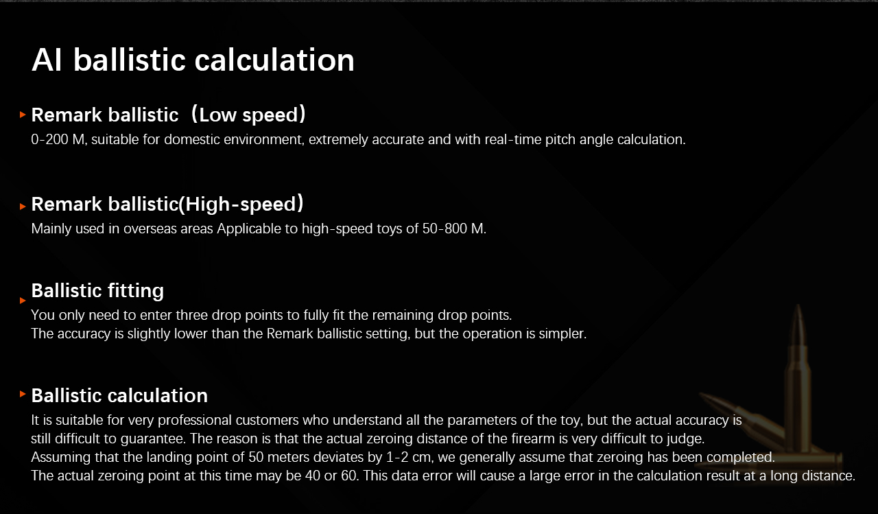 It is suitable for very professional customers who understand all the parameters of the toy, but the actual accuracy is still difficult to guarantee. The reason is that the actual zeroing distance of the firearm is very difficult to judge. Assuming that the landing point of 50 meters deviates by 1-2 cm, we generally assume that zeroing has been completed. The actual zeroing point at this time may be 40 or 60. This data error will cause a large error in the calculation result at a long distance.